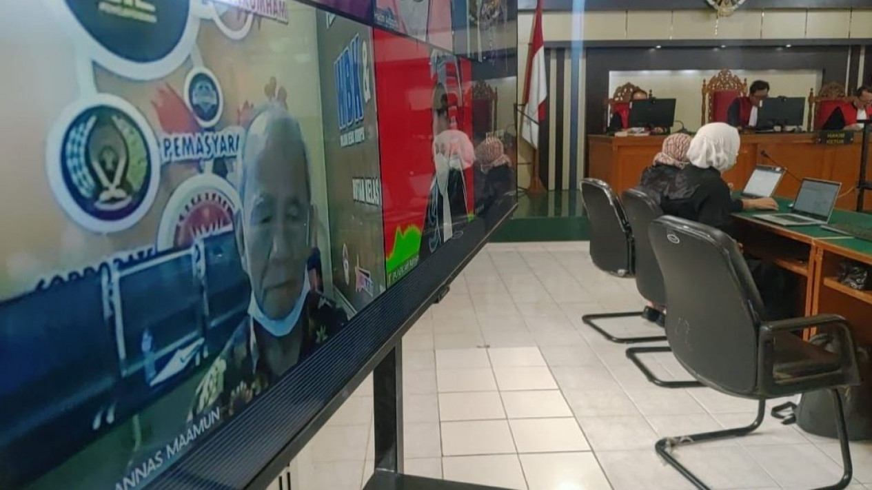 Dari persidangan, tampak Annas Maamun yang kini berusia 83 tahun hadir secara virtual dari Rutan Sialang Bungkuk, menggunakan baju batik motif bunga.
