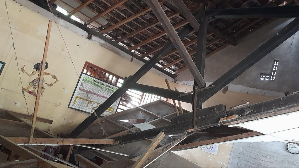 Gunungkidul, DIY - Kejadian atap ruang kelas runtuh kembali terjadi di Gunungkidul, Yogyakarta. Insiden kali ini terjadi di ruang kelas 2 sekolah MI Muhammadiyah Blembem, Kalurahan Candirejo, Kapanewon Semin, Gunungkidul, Kamis (17/11/2022) pagi.