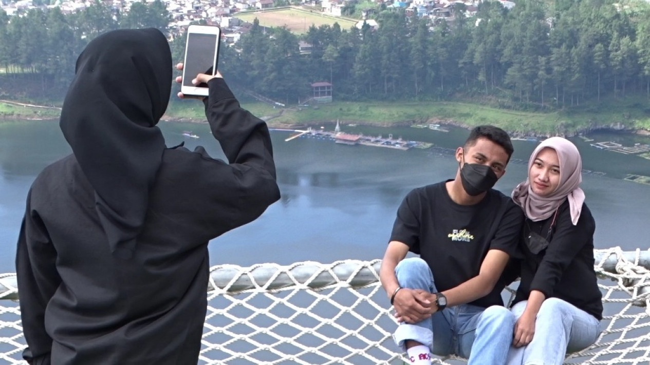 Wisatawan mengabadikan momen di atas Telaga Menjer Kahyangan Skyline, Wonosobo..