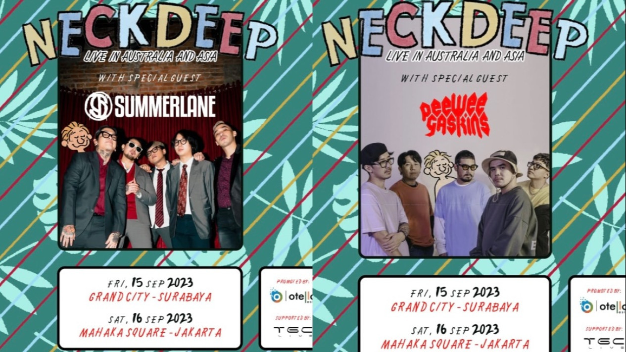 Jakarta, tvOnenews.com - Konser tunggal Neck Deep akan digelar dalam beberapa pekan lagi di Surabaya dan Jakarta. Otello Asia mengumumkan akan menghadirkan dua band terkemuka Indonesia, Pee Wee Gaskins dan Summerlane, sebagai Special Guest Star dalam konser Neck Deep Live in Australia and Asia 2023 yang akan digelar di Grand City, Surabaya, pada 15 September 2023 dan Mahaka Square, Jakarta, pada 16 September 2023, mendatang.