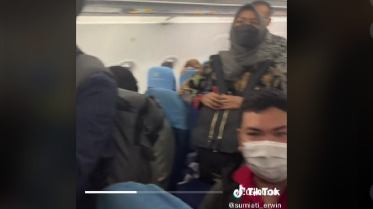 Kemudian pemilik akun TikTok sumiati_erwin mengunggah kondisi di dalam pesawat Ketika para penumpang bersiap turun dan mengambil barang bawaannya, terlihat juga pada cuplikan video, seorang penumpang wanita berdiri meminta seluruh penumpang kompak untuk turun bersama-sama.