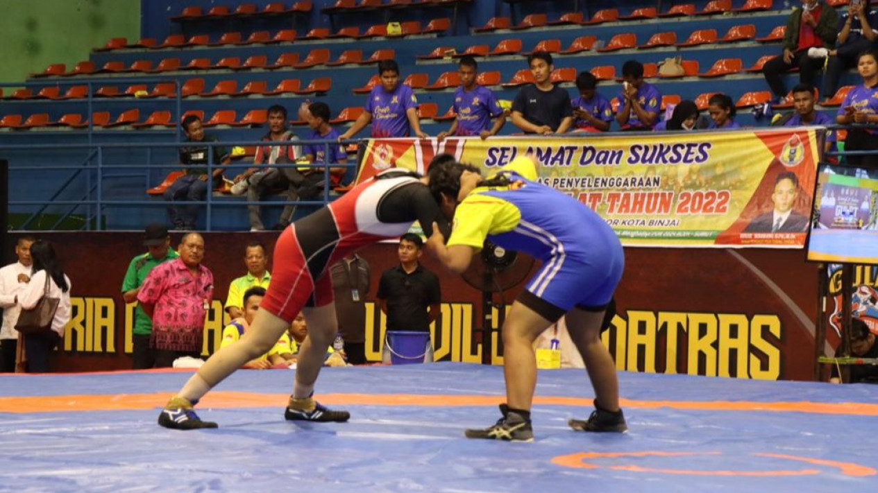 Binjai, Sumatera Utara - Guna mempersiapkan atletnya dalam menghadapi Pekan Olahraga Nasional (PON) tahun 2024 mendatang, Persatuan Gulat Seluruh Indonesia (PGSI) Sumatera Utara melaksanakan Kejuaraan Daerah (Kejurda) yang dilaksanakan di Gedung Olahraga Binjai, Jalan Jambi, Kelurahan Rambung Barat, Kecamatan Binjai Selatan, Kota Binjai, Jumat (16/9/2022).