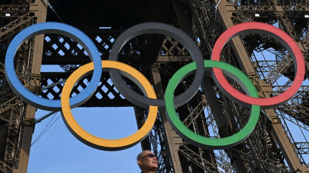 Cincin Olimpiade terpasang di Menara Eiffel, Paris, Prancis, Rabu (24/72024)..