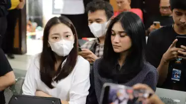 Dengan memakai pakaian hitam Amanthy Fahimah Hanin tampak duduk ditemani teman wanitanya di persidangan mendengarkan jalannya sidang vonis Hendra Kurniawan.
