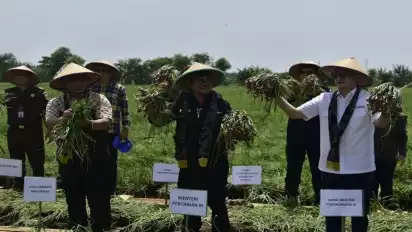 Brebes, tvOnenews.com - Menteri Pertanian Syahrul Yasin Limpo (Mentan SYL) bersama Wakil Menteri Perdagangan, Jerry Sambuaga bersama Wakil Gubernur Jawa Tengah KH. Taj Yasin Maimoen melakukan panen raya sekaligus pelepasan bawang merah di Kabupaten Brebes sebanyak 25 truk atau 175 ton ke Pasar Induk Kramat Jati, Jakarta.