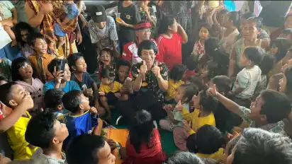 Kemudian, Seto Mulyadi langsung menyapa para warga yang ada di posko. Ia pun langsung dikerumuni oleh anak-anak.