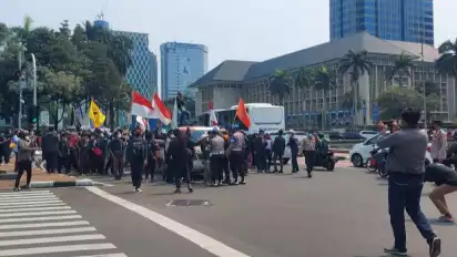 Jakarta - Ratusan mahasiswa dari Universitas Indraprasta PGRI menutup jalan protokol di sekitar Bundaran Patung Kuda, Jalan Medan Merdeka Selatan, Jakarta Pusat.