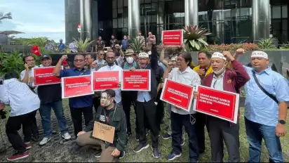 Sebelum melapor ke Dewas, para mantan pimpinan KPK menggelar aksi unjuk rasa di depan Gedung Merah Putih KPK, Jakarta. Mereka mendesak agar Firli Bahuri mundur dari jabatannya sebagai Ketua KPK.
