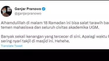 "Alhamdulillah di malam 18 Ramadhan ini bisa salat tarawih bareng temen-temen mahasiswa dan seluruh civitas akademika UGM. Banyak sekali kenangan yang tercecer di sini. Apalagi waktu Ramadan, sering nyari takjil di masjid ini. Hehehe," tulis Ganjar, dikutip Kamis (13/4/2023).