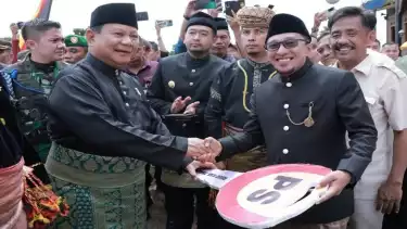 Sumbar, tvOnenews.com - Menteri Pertahanan (Menhan) RI, Prabowo Subianto menghadiri undangan acara Batagak Gala Wakil Menteri Tenaga Kerja dan Transmigrasi Afriansyah Noor yang ditunjuk menjadi Datuk Rajo Basa di Istano Pagaruyuang, Kabupaten Tanah Datar, Sumatera Barat, Sabtu (29/4/2023).
