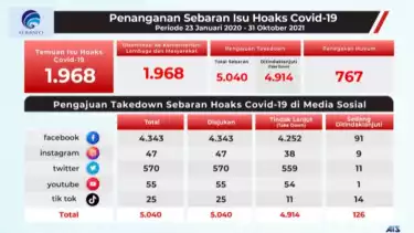 Jakarta - Kementerian Komunikasi dan Informatikan menyatakan hingga Minggu 31 Oktober 2021, terdapat 1.968 temuan isu hoaks Covid-19. Data ini merupakan akumulasi temuan sejak 23 Januari 2020 dalam penanganan sebaran isu hoaks Covid-19 yang dirilis Minggu (31/10/2021).