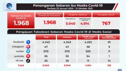 Sementara itu, berdasarkan data pengajuan 'takedown' sebaran hoaks Covid-19 di media sosial, dirinci sebagai berikut;