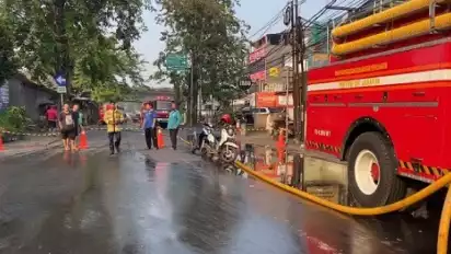 Lebih dari 5 unit mobil pemadam kebakaran masih melakukan pemadaman dengan mengambil air dari aliran sungai Banjir Kanal Timur (BKT).