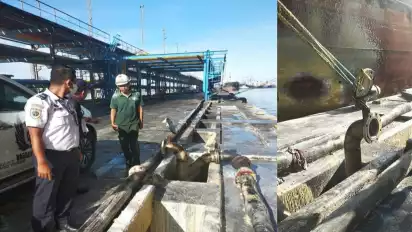 Dumai, Riau - Minyak hasil pengolahan dari kelapa sawit jenis Palm Fatty Acid Distillate (PFAD) yang digunakan sebagai bahan baku biofuel dan Split Palm Fatty Acid Distillate (SPFAD) milik PT Kreasi Adhikarya tumpah dan berserakan ke laut karena pipa pendistribusian pecah saat loading, yang terjadi sekitar pukul 20.00 wib, Selasa (09/11/2021).