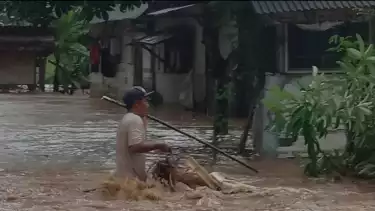 Seorang Warga Sedang Menerjang Banjir di Banyuwangi
