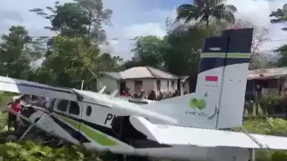 Kemudian, dari video beredar, tampak warga dengan aparat TNI mengvakuasi pesawat yang tergelincir dan terperosok ke rerumputan.