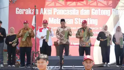 tvOnenews.com - Badan Pembinaan Idelogi Pancasila (BPIP) dan Mahasiswa Universitas Negeri Semarang (UNNES) menyelenggarakan Gerakan Aksi Pancasila dan Gotong Royong Melawan Stunting di Kabupaten Magelang, Jawa Tengah, tepatnya di lapangan Kecamatan Bandongan, Sabtu, (5/8).