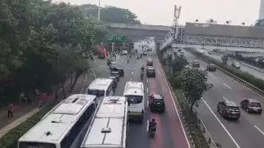 Sebelum sampai ke kawasan Gedung MK dan Istana Negara, massa buruh sempat diadang anggota polisi saat memasuki area Simpang Susun Semanggi untuk mengarah ke lokasi aksi di kawasan Patung Kuda, Jakarta Pusat.