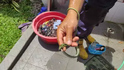 "Tadi cara mengeluarkan ular dari dalam (pipa) paralon dengan disiram air, dan ularnya keluar. Langsung kami tangkap dan diamankan oleh petugas. Ular tambang ini sudah kedua kalinya masuk di rumah warga ini. Diduga karena sekarang masuk musim penghujan," kata Ferdy.