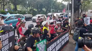 Jakarta, tvOnenews.com - Koalisi Ibu Kota menggelar aksi di depan kantor Balai Kota DKI Jakarta. Puluhan massa ini menuntut Pemprov DKI lebih serius dalam menangani polemik polusi udara.