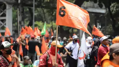 Jakarta, tvOnenews.com - Ratusan buruh dari berbagai aliansi dan Partai Buruh, tampak memenuhi area patung kuda, Jakarta, Senin (25/9/2023).