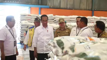 tvOnenews.com - Presiden Republik Indonesia (RI) Joko Widodo didampingi Penjabat (Pj) Gubernur Sumatera Selatan (Sumsel) Agus Fatoni meninjau persediaan pangan, terutama beras. Peninjauan ini dilakukan di Gudang Bulog Sukamaju, Palembang, Sumatera Selatan, Kamis (26/10/2023).