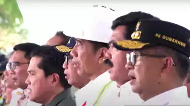 Kemudian di sebelah Bambang adalah Menteri BUMN Erick Thohir, Menteri Perhubungan Budi Karya Sumadi, dan Presiden Jokowi.