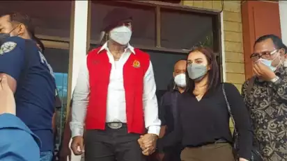 Setelah 3,5 jam menjalani pemeriksaan berkas dan barang bukti, Jerinx keluar dari Gedung Kejaksaan Negeri Jakarta Pusat dengan mengenakan rompi merah, sambil menggandeng sang istri, Nora Alexandra.
