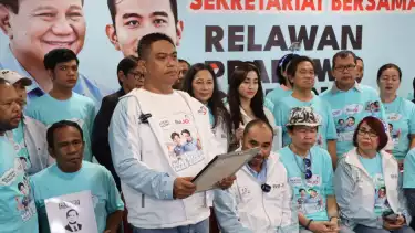 tvOnenews.com - Relawan Benteng Jokowi (BEJO) resmi mendeklarasikan dukungannya kepada Prabowo dan Gibran untuk memenangkan kontestasi pemilihan Presiden dan Wakil Presiden periode 2024-2029. Pernyataan dukungan tersebut dilakukan Relawan BEJO di Sekretariat bersama relawan kemenangan Prabowo-Gibran di Jakarta. Dalam pencanangan dukungannya tersebut, Relawan BEJO siap mendukung Prabowo-Gibran untuk dapat memenangkan pemilihan Presiden dan Wakil Presiden Republika Indonesia dalam satu putaran.