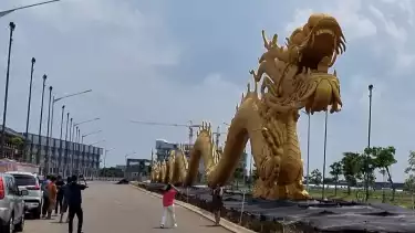 tvOnenews.com - Patung naga raksasa berwarna kuning keemasan itu berdiri gagah diatas median Jalan Salembaran, Kawasan Day Night Distric Pantai Indah Kosambi (PIK2), Kecamatan Kosambi, Kabupaten Tangerang, Banten.