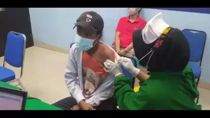 "Datangnya sama teman sekolah (SMP), tidak ada rasa sakit dan saya memang ingin sehat biar tidak kena Covid-19," akui pelajar usia 13 tahun itu. (Bahana/Lno)