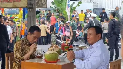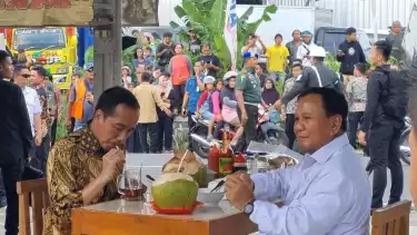 Presiden Jokowi dan Menhan Prabowo tampak asyik makan bakso dan teh manis, beserta air kelapa.