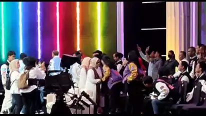 Pantauan tvonenews.com, hal itu bermula saat Siti Atiqoh dan anaknya, Alam Ganjar, bangun dari tempat duduknya yang berada di sayap kanan panggung.