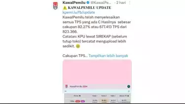 "Dari hasil real count KawalPemilu menempatkan Prabowo-Gibran unggul dengan 58,44%. KawalPemilu memastikan telah menyelesaikan semua TPS yang ada C, hasilnya sebesar cakupan 82.27% atau 677.413 TPS dari 823.366," tulis keterangan KawalPemilu.org seperti dilihat pada akun X resminya, @KawalPemilu_org yang dilihat Rabu, (13/3).
