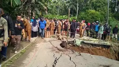 “Untuk saat ini, kondisi jembatan tidak bisa dilalui sama sekali baik kendaraan roda dua maupun roda empat. Maka dari itu kita mengambil langkah untuk pembangunan jembatan darurat menggunakan batang pohon kelapa,” kata Dendi.