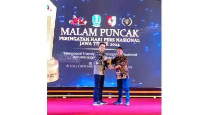 Penghargaan tertinggi PWI Jatim itu diserahkan pada acara malam resepsi puncak peringatan Hari Pers 2024 Tingkat Jatim, bertempat di Convention Hall New Sari Utama, Kota Jember, Minggu (28/4/2024) malam.