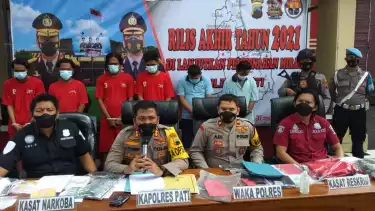 "Penyelesaian 189 kasus, dibandingkan tahun kemarin naik 37%. Jadi pengungkapan kasus naik. Kasus narkoba 43 kasus dengan 71 tersangka, 100% kasus selesai dengan jumlah barang bukti sabu 93,5 gram, pil koplo 2600 butir, tembakau gorila 16,2 kilogram. Menjelang akhir tahun, kita juga berhasil mengamankan 1,15 gram sabu dengan tiga orang tersangka yang saat kita tangkap sedang melakukan pesta sabu," Kata AKBP Christian Tobing, dalam gelar rilis akhir tahun di Mapolres Pati, Jumat (31/12/2021).