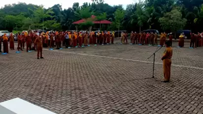 Pada apel gabungan ini sejumlah pegawai terlihat melanggar protokol kesehatan. Banyak pegawai terlihat tidak memakai masker saat apel berlangsung.