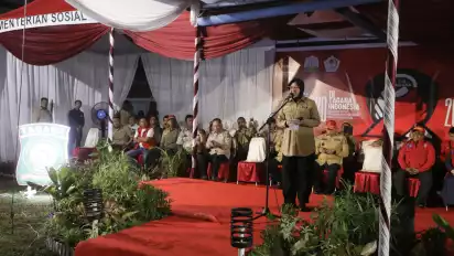 Menteri Sosial Tri Rismaharini menghadiri upacara Santi Aji dalam rangka memperingati HUT Ke-20 Taruna Siaga Bencana (Tagana).