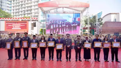 tvOnenews.com - Kementerian Agraria dan Tata Ruang/Badan Pertanahan Nasional (ATR/BPN) menerima Piagam Penghargaan Mitra Kerja atas Percepatan Penyertipikatan Tanah di Pulau Nusakambangan. Sekretaris Jenderal (Sekjen) Kementerian ATR/BPN, Suyus Windayana yang hadir mewakili Menteri ATR/Kepala BPN, Agus Harimurti Yudhoyono (ATR/BPN) menerima penghargaan tersebut pada saat Upacara Hari Pengayoman ke-79 Tahun 2024 di Lapangan Kementerian Hukum dan Hak Asasi Manusia (HAM), Jakarta, Senin (19/08/2024).