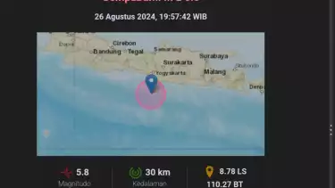 "Info Gempa Mag:5.8, 26-Agu-24 19:57:42 WIB, Lok:8.78 LS, 110.27 BT (95 km BaratDaya GUNUNGKIDUL-DIY), Kedlmn:30 Km #BMKG," tulis laman BMKG.