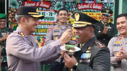 Purworejo, tvOnenews.com - Sinergitas antara TNI dan Polri kembali terlihat dalam peringatan Hari Ulang Tahun (HUT) TNI ke-79 yang jatuh pada 5 Oktober 2024. Kapolres Purworejo, AKBP Edi Bagus Sumantri., S.I.K bersama jajarannya, menyambangi Markas Kodim 0708/Purworejo dan Markas Yonif 412/BES untuk memberikan ucapan selamat secara langsung kepada Dandim 0708/Purworejo, Letkol Yohanes Heru Wibowo , dan Danyon 412/BES beserta seluruh personel TNI. Sabtu (5/10/2024)