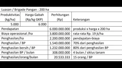 “Setelah dikurangi biaya operasional sebesar Rp19 juta per hektare atau total Rp3,8 miliar untuk lahan 200 hektare, maka perkiraan pendapatan bersih dari budidaya padi ini adalah sebesar Rp2,2 miliar dan nantinya dibagi antara brigade dan pemilik lahan,” tambahnya.