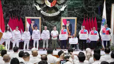 tvOnenews.com - Penjabat (Pj.) Gubernur DKI Jakarta Teguh Setyabudi memberikan penghargaan kepada para atlet, pelatih, asisten pelatih, pemecah rekor, dan juara umum cabang olahraga dalam Pekan Olahraga Nasional (PON) XXI/2024 di Aceh dan Sumatera Utara, serta Pekan Paralimpiade Nasional (Peparnas) XVII/2024 di Solo, Jawa Tengah, di Balai Agung, Balai Kota DKI Jakarta, pada Senin (9/12). Ia menyebut, perjuangan para atlet, pelatih, dan asisten pelatih berbuah manis dalam ajang PON dan Peparnas.