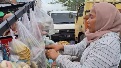 Sejak matahari belum terbit, Yuli sudah menyusun rapi menu rebusan di atas sebuah tampah untuk dijual kepada warga desa dengan berjalan kaki.