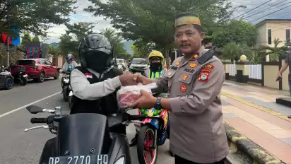 Palopo, tvOnenews.com - Polres Palopo menggelar kegiatan jumat berkah di depan Mako Polres Palopo, pada (7/3/2025) sore, dengan membagikan takjil kepada pengendara atau masyarakat yang melintas di depan Mako Polres Palopo.