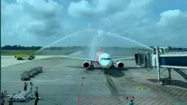 tvOnenews.com - Bandara Internasional Syamsudin Noor di Banjarmasin, Kalimantan Selatan, resmi melayani penerbangan internasional, pada Senin (20/10) pagi, ditandai dengan mendaratnya pesawat AirAsia rute Kuala Lumpur-Banjarmasin. Penerbangan internasional perdana ini disambut dengan prosesi water salute dan menandai babak baru konektivitas udara Kalimantan Selatan dengan negara luar.