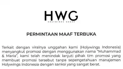 “Terkait dengan viralnya unggahan kami (Holywings Indonesia) menyangkut promosi dengan menggunakan nama "Muhammad & Maria", kami telah menindaklanjuti pihak tim promosi yang membuat promosi tersebut tanpa sepengetahuan manajemen Holywings Indonesia dengan sanksi yang sangat berat,” tulis Holywings dalam keterangan unggahan permintaan maaf.