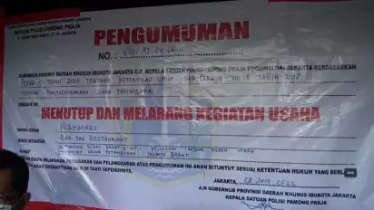 Dalam spanduk tertera tulisan "Pengumuman" yang dicetak dalam ukuran besar. Disebutkan, penyegelan itu merupakan instruksi Gubernur Provinsi Daerah Khusus Ibu Kota Jakarta yang diamanatkan kepada Kepala Satuan Polisi Pamong Praja Provinsi DKI Jakarta berdasarkan Perda 8 Tahun 2007 tentang Ketertiban Umum dan Pergub nomor 18 tahun 2018 tentang Penyelenggaraan Usaha Pariwisata.