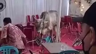 Menurut keterangan yang tersedia, sapi sempat mengacak-acak tenda hajatan warga, terlihat sejumlah kursi tamu diseruduk oleh sapi tersebut.